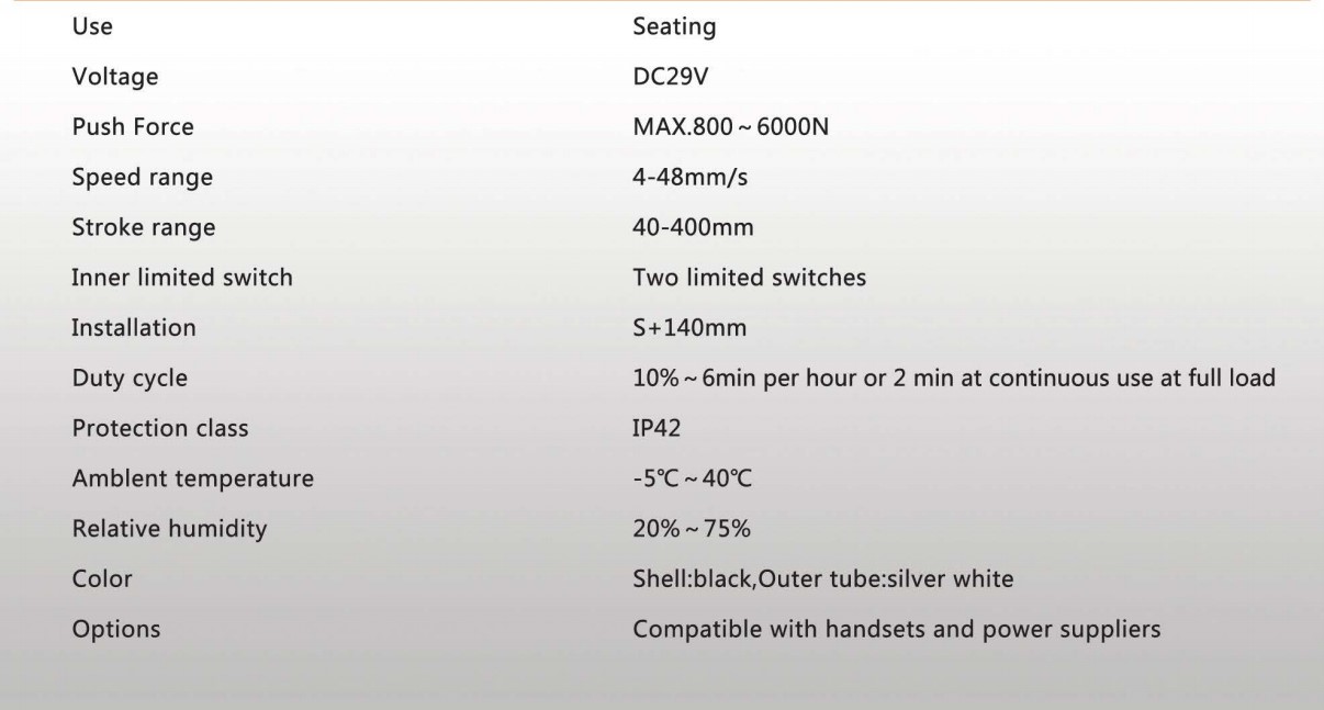 本產品已通過CE、UL、PSE、ISO9001認證,它有一個新穎的外觀和制作精良,噪音小,操作簡單,讓它成為暢銷國內外,被廣泛用于電動沙發、醫療床、手術床,按摩椅等。