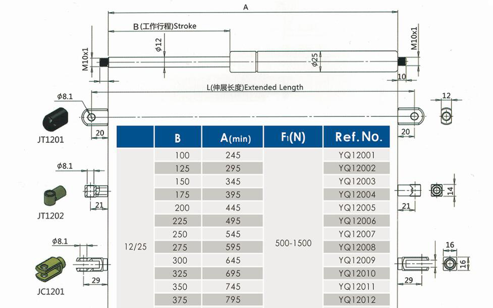 注:由于氣彈簧是非標準的,以上僅為型號的一部分。我們可以根據客戶的要求定制。